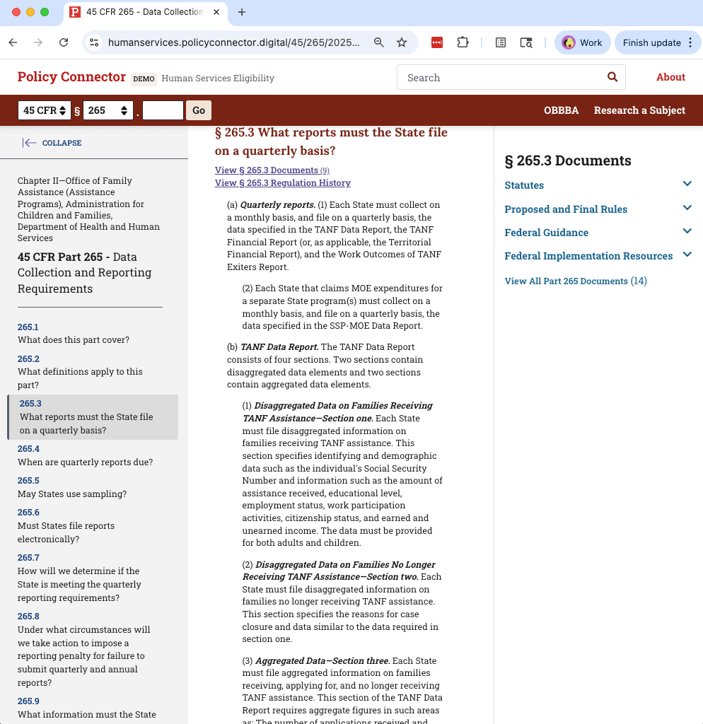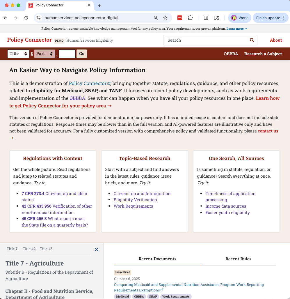 Policy Connector is a web app that saves policymakers time by bringing together statute, regulations, and guidance.